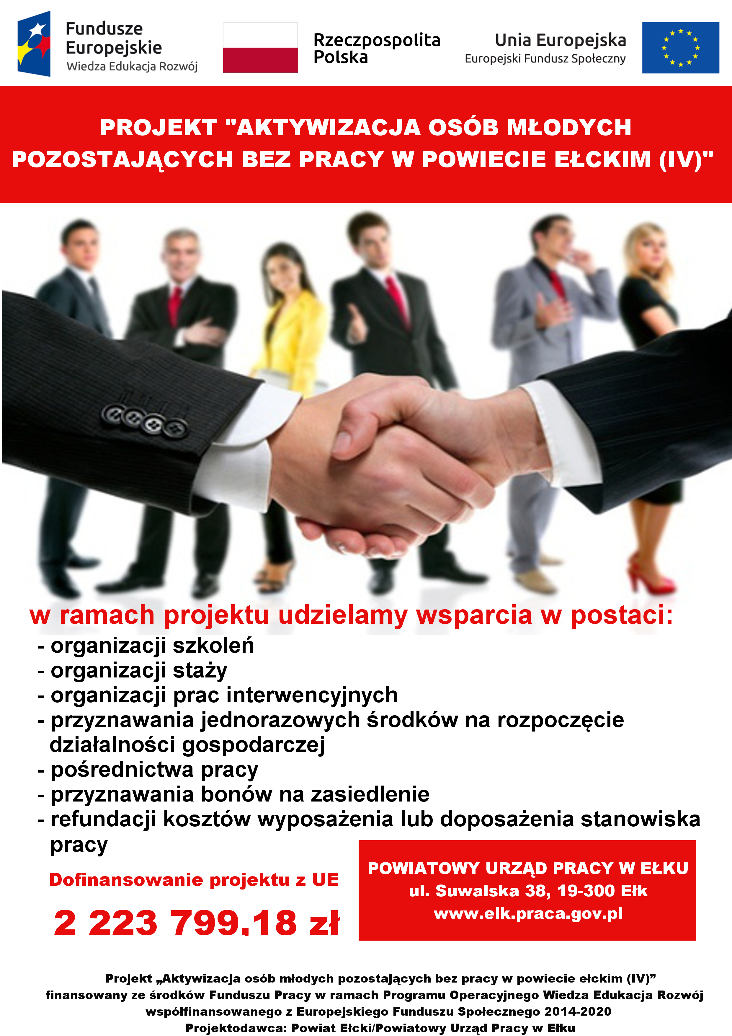 Powiatowy Urząd Pracy w Ełku realizuje Projekt „Aktywizacja osób młodych pozostających bez pracy w powiecie ełckim (IV)"w ramach Programu Operacyjnego Wiedza Edukacja Rozwój Oś Priorytetowa I Osoby młode na rynku pracy, Działania 1.1 Wsparcie osób młodych pozostających bez pracy na regionalnym rynku pracy, Poddziałania 1.1.1 Wsparcie udzielane z Europejskiego Funduszu Społecznego.